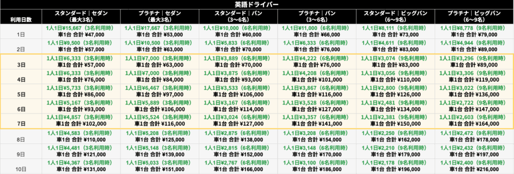 日本語が堪能なドライバーも在籍しており日本語ドライバーを選択するオプションも御座います。プラチナプランでは観光資格を保有するドライバーによる観光地への同行や説明も承っています。