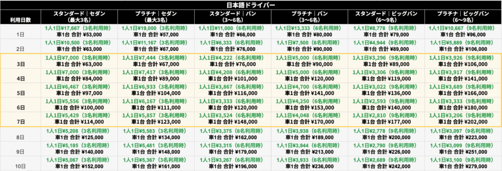 このように、グループで利用すれば割り勘効果で一人当たりの費用が大幅ダウンし、限られた旅行日程でも効率よく好きな場所を巡れるためコストパフォーマンスは抜群です。3人以上のグループなら広々としたワゴン車タイプ(バン)も利用可能で、大きな荷物やお土産も余裕で積み込めます。